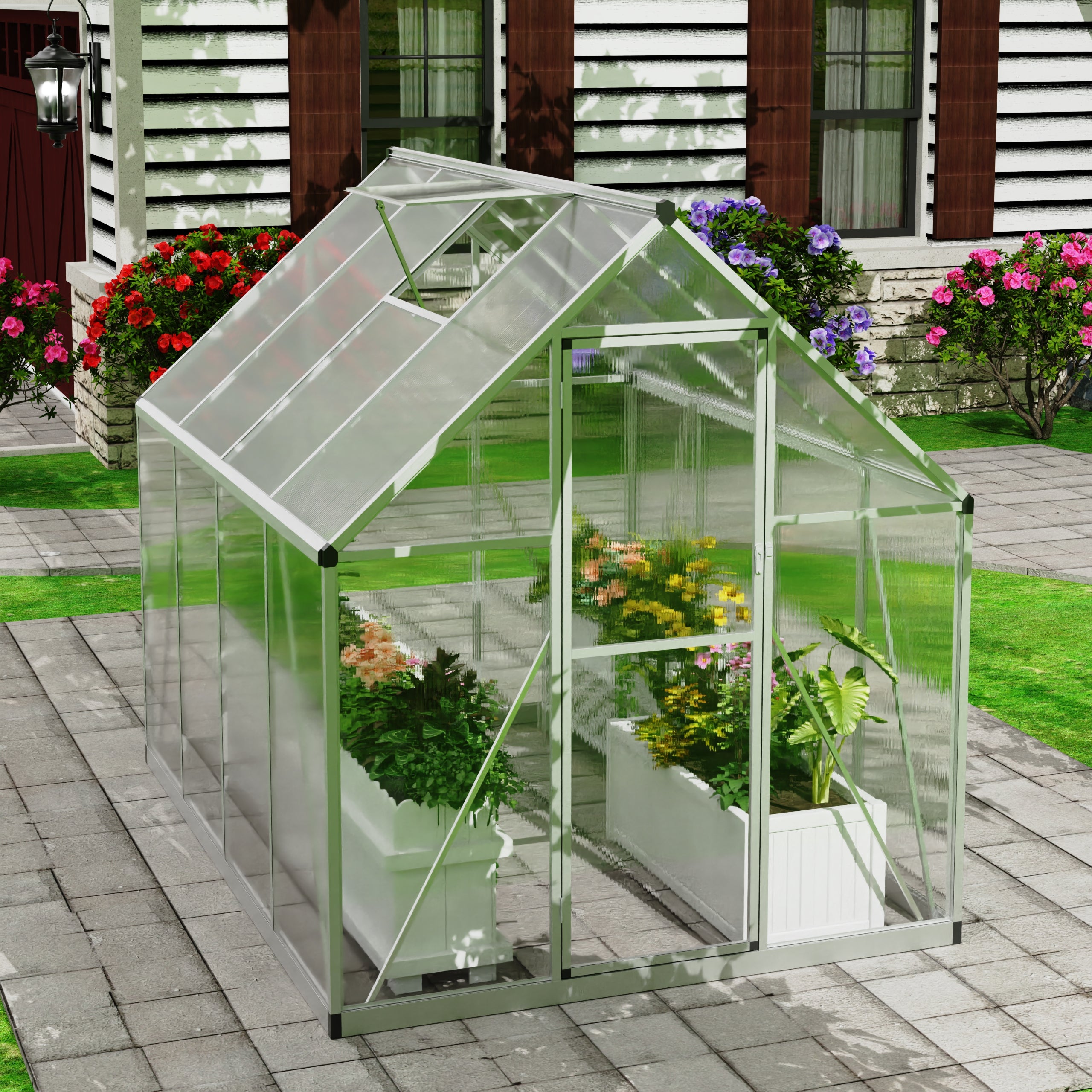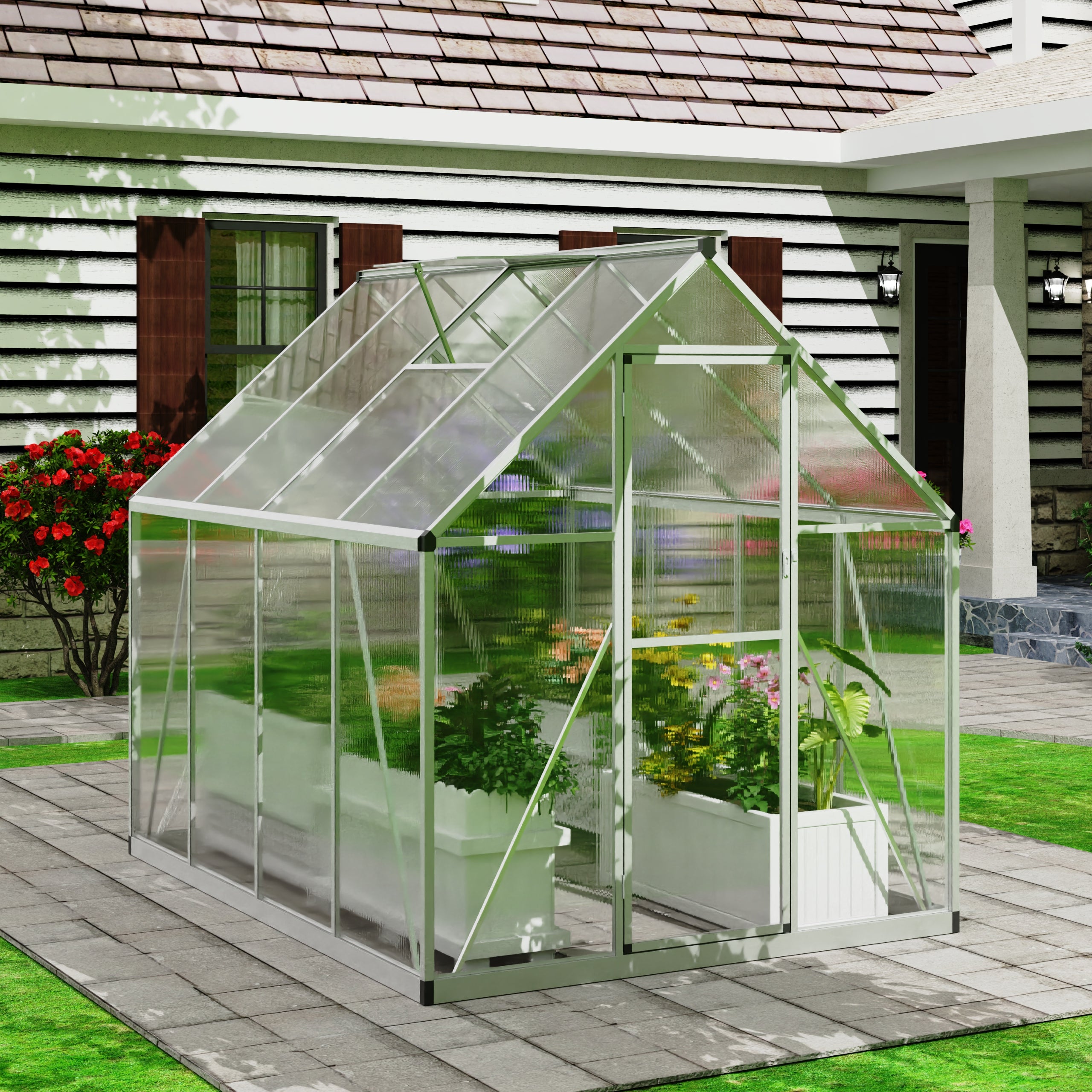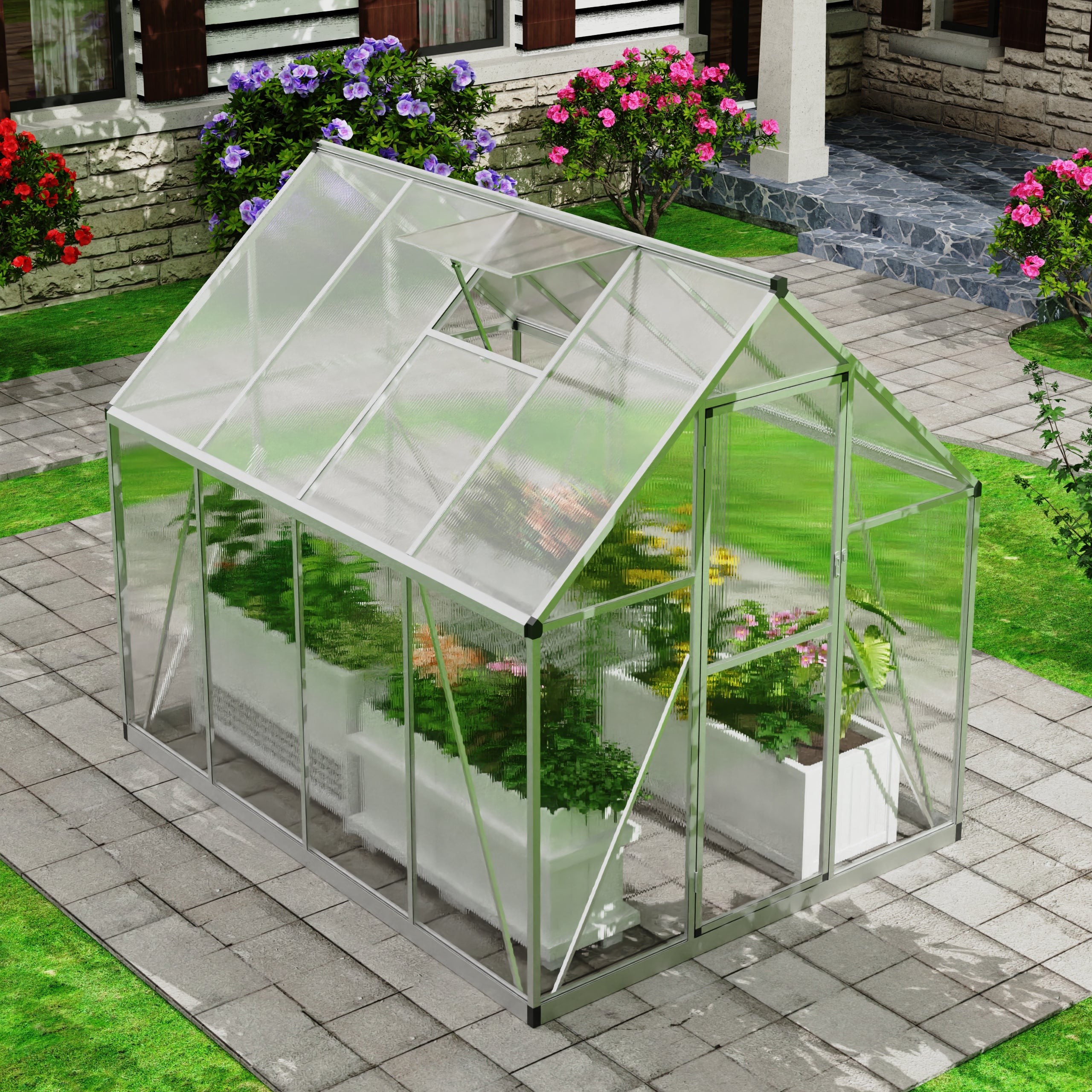 Goodyo® 7.35’ x 5.56’ Polycarbonate Greenhouse for Outdoors with Roof Vent Window & Lockable Door for Garden, Backyards, Walk in Aluminum Frame, Silver