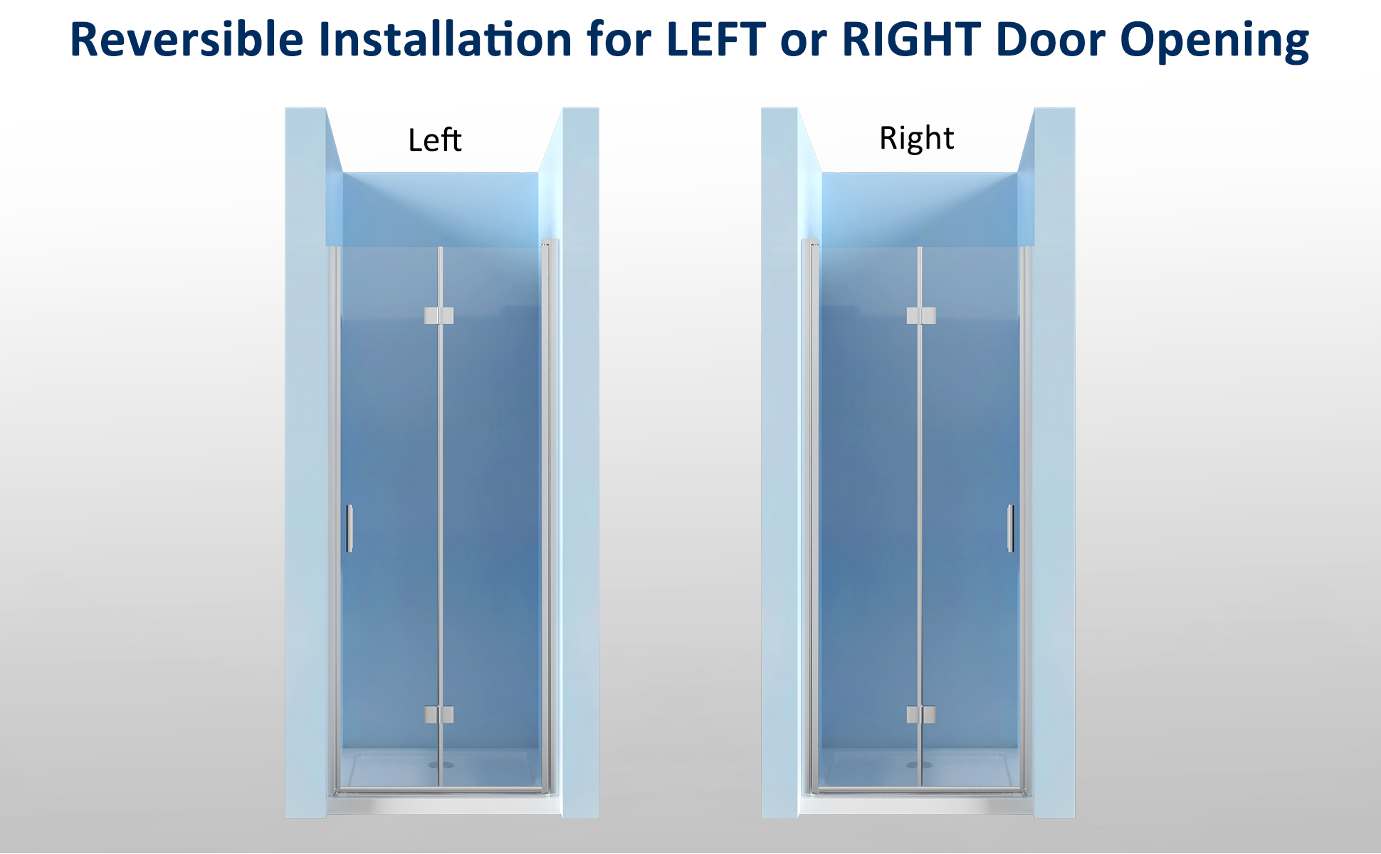• Bifold Glass Shower Door: The assembled size of this pivot swing door is 30. in W x 72. in H, the width can be adjusted from 30” to 31.2”, with an adjustment width 0.6” (15mm) on each side. Walk-in opening: 23 in. All hardware is chrome finish.