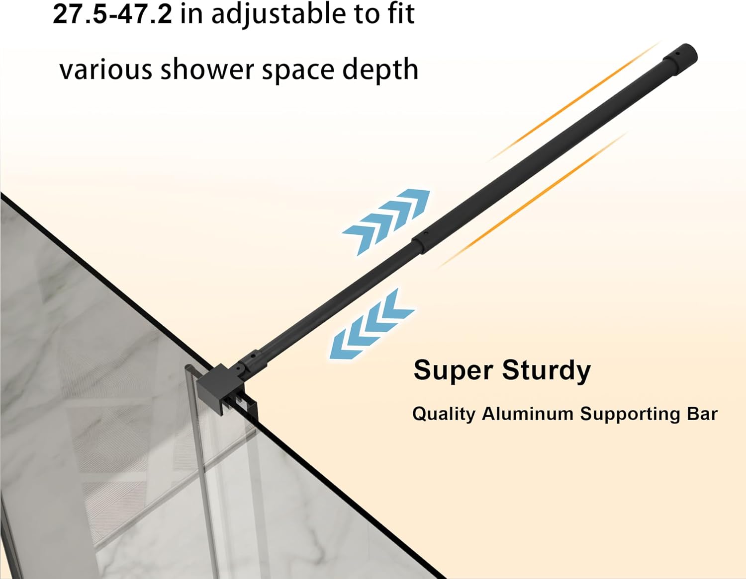 • Sturdy Construction: Crafted from 1/4” tempered glass, this shower door is not only resilient but also shatter-resistant for your safety. The high-quality aluminum alloy frame further provides more protection to the glass door. The 27.5” - 47.2” length adjustable supporting bar can either be mounted to wall or ceiling, ensuring the door is steady and stable during daily use.