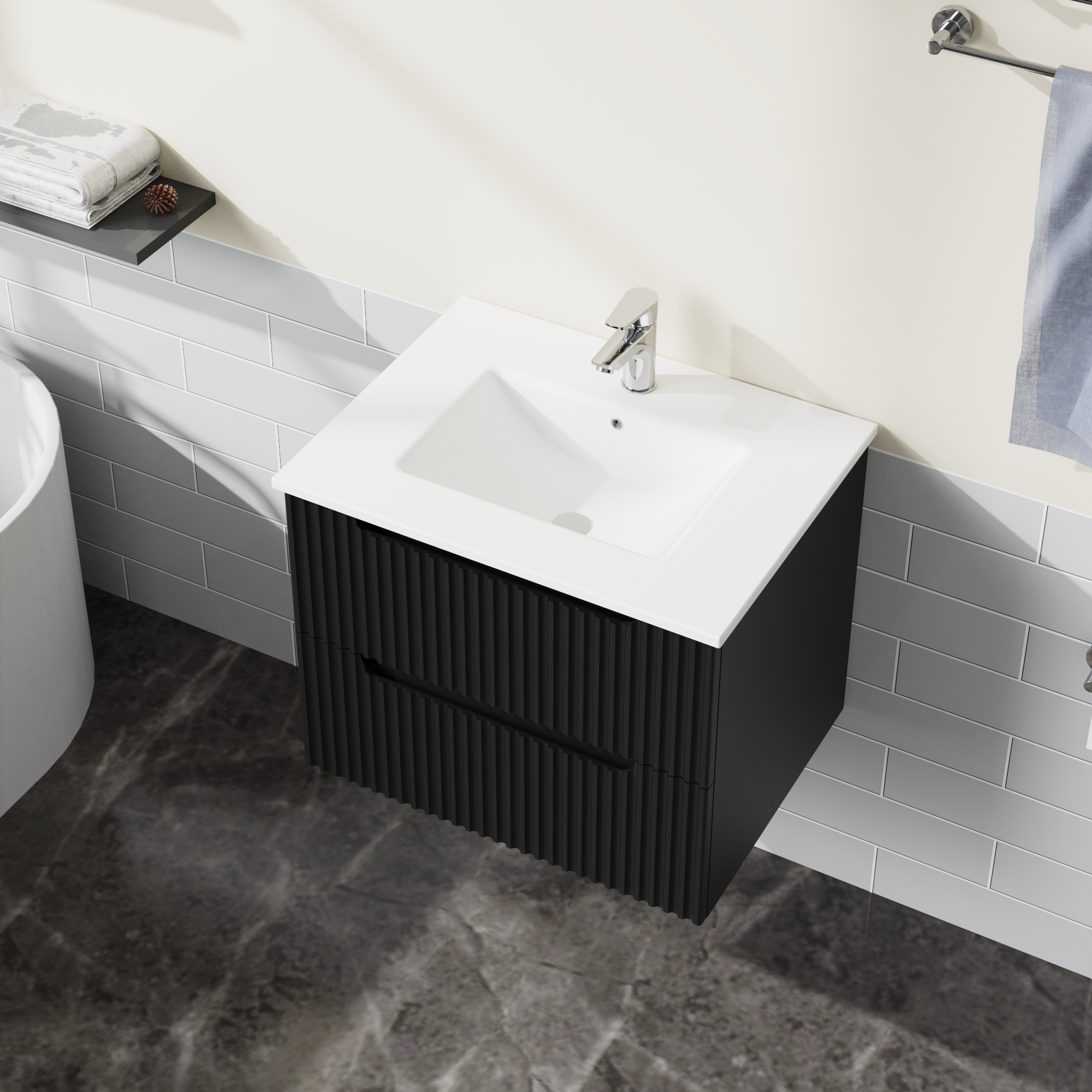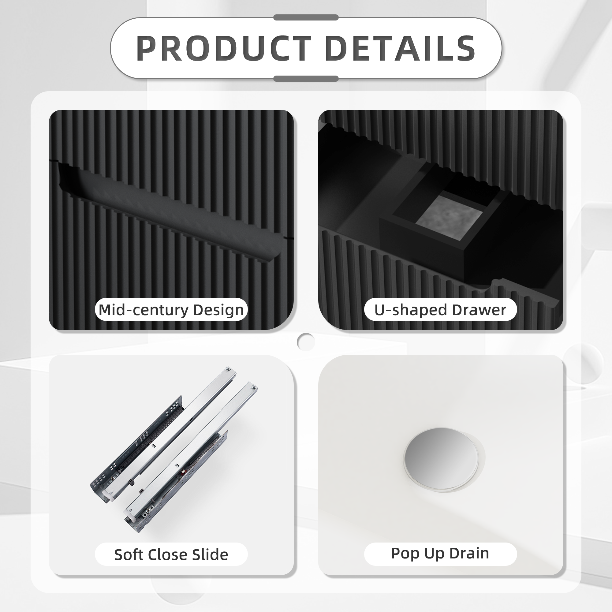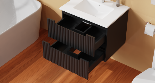 • Modern Design: The vanity merges contemporary and mid-century design aesthetics. The front of the cabinet features two large drawers with a textured design, giving off a classic vibe that looks neat and really nice. The wall-mounted design also maximizes floor space, making your bathroom feel more open and spacious.