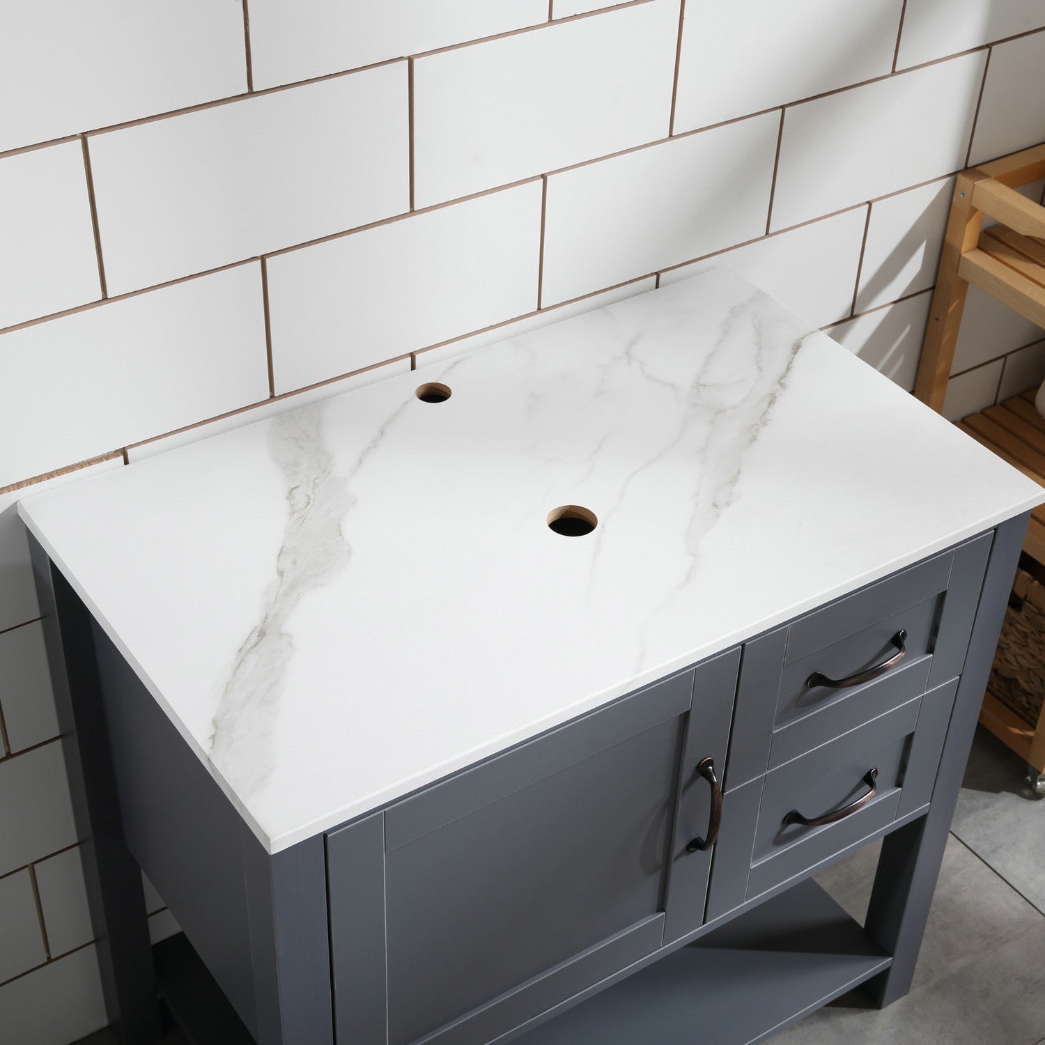 • Noted: The vanity top is an artificial coating surface, not real marble; This vanity cabinet requires assembling and installation and will be shipped in 2