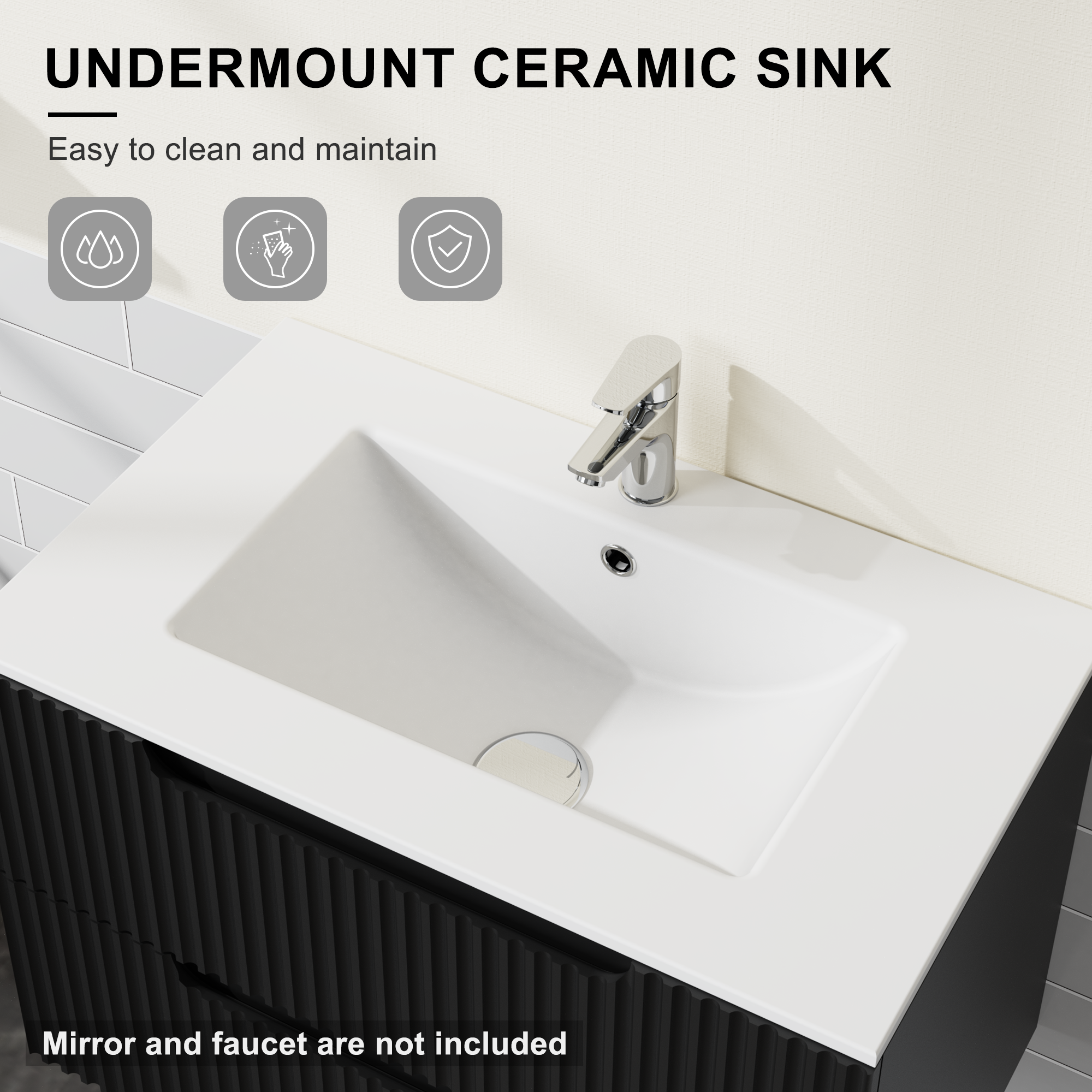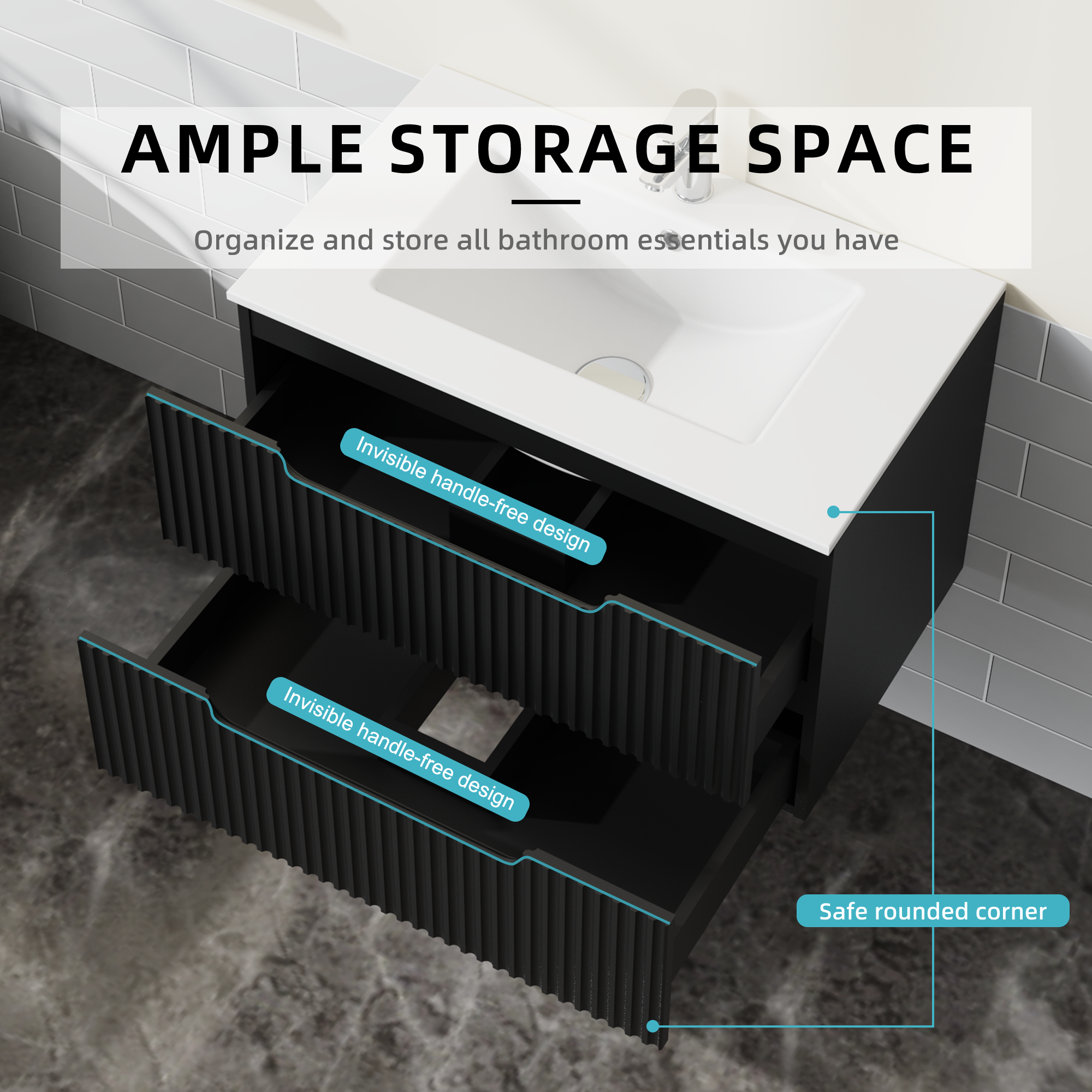 • Modern Design: The vanity merges contemporary and mid-century design aesthetics. The front of the cabinet features two large drawers with a textured design, giving off a classic vibe that looks neat and really nice. The wall-mounted design also maximizes floor space, making your bathroom feel more open and spacious.
